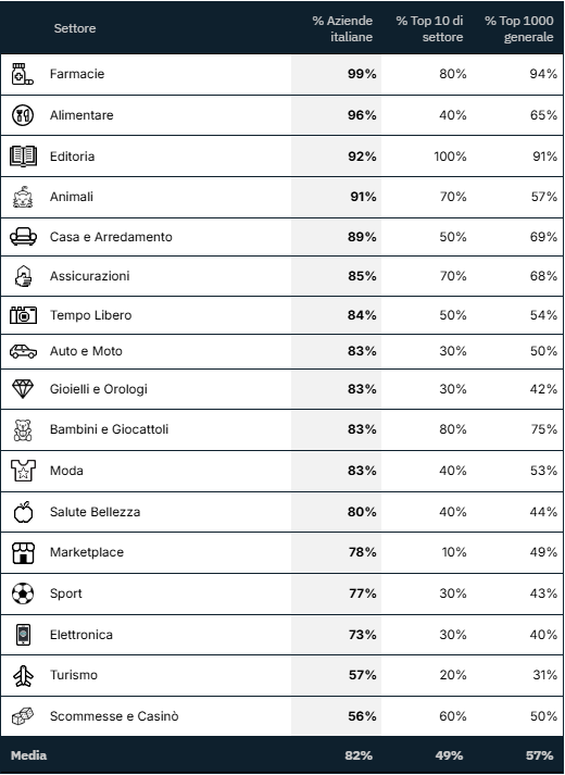 La percentuale di aziende italiane del settore vede al primo posto le Farmacie (99%), al secondo Alimentare (96%), al terzo Editoria (92%).